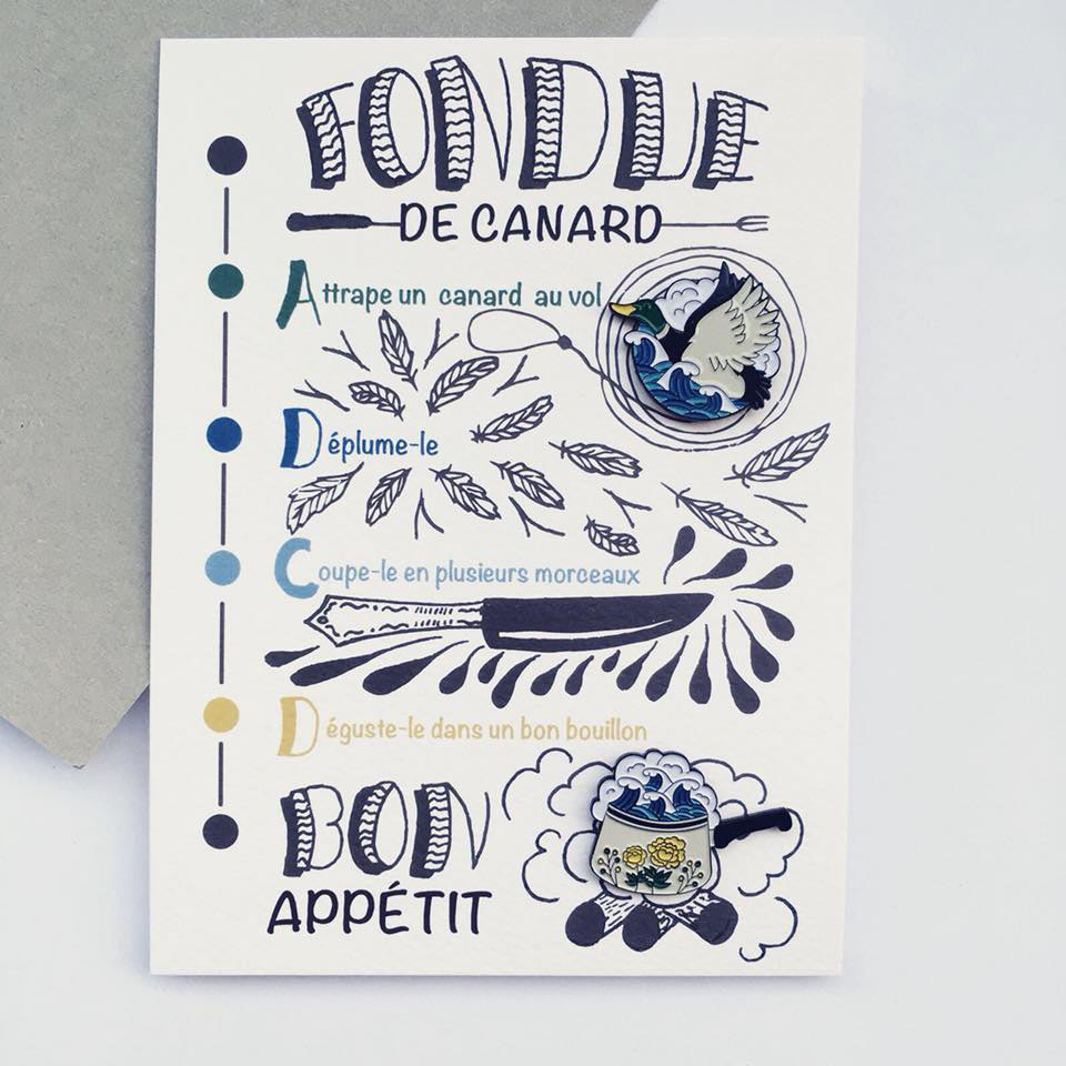 duck fondue recipe. Two unique enamel pins I created for "le panier culturel", a swiss basket of culture.